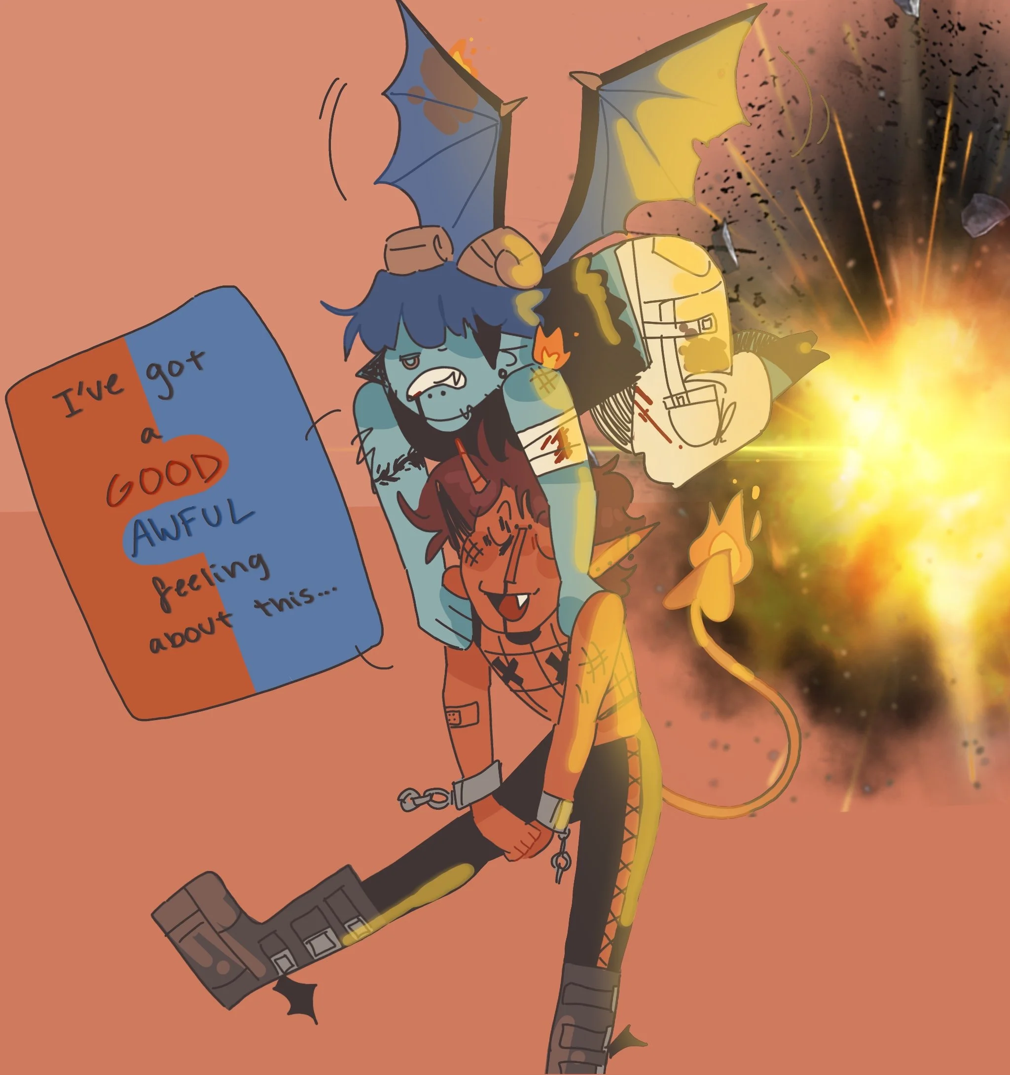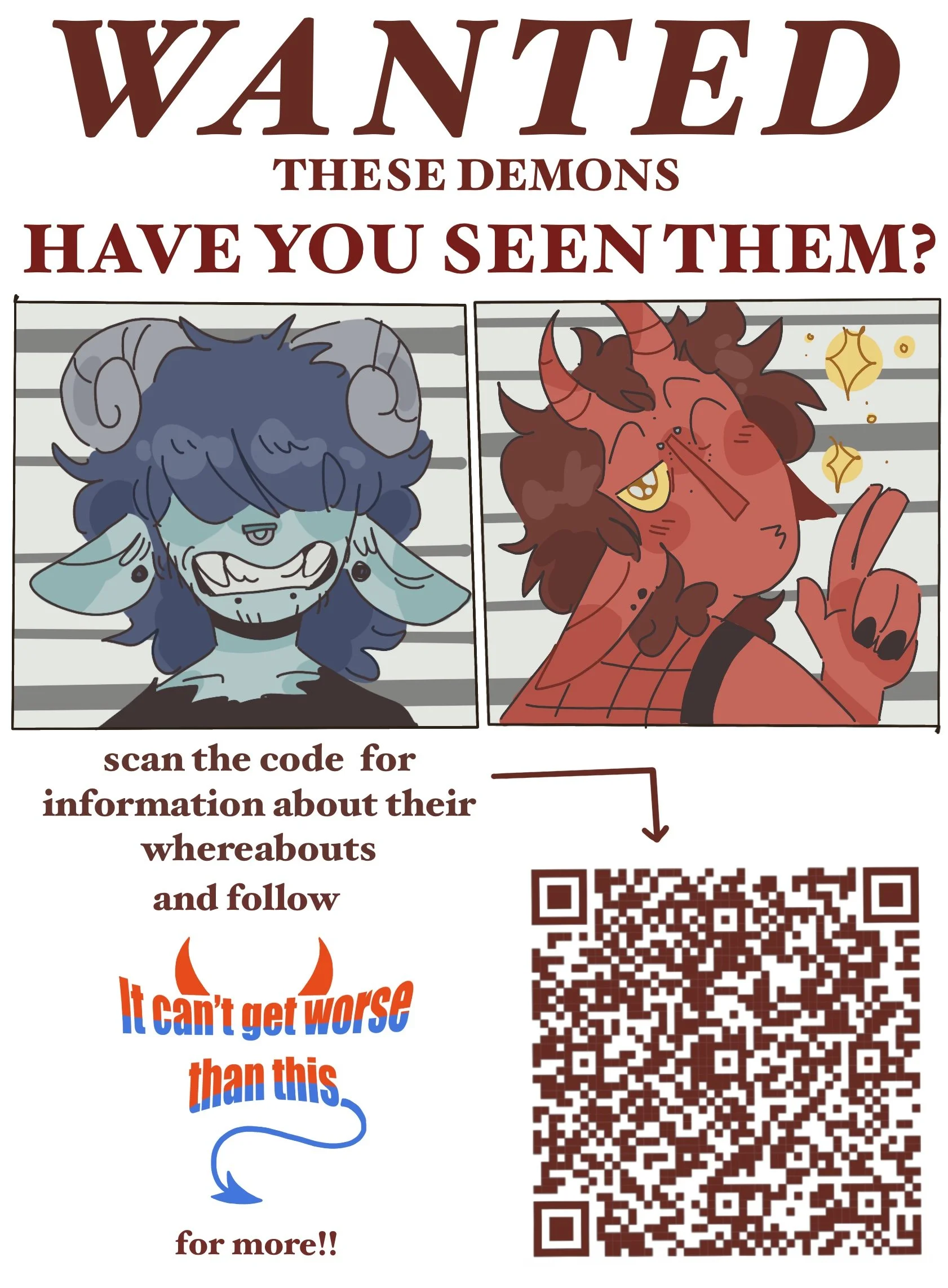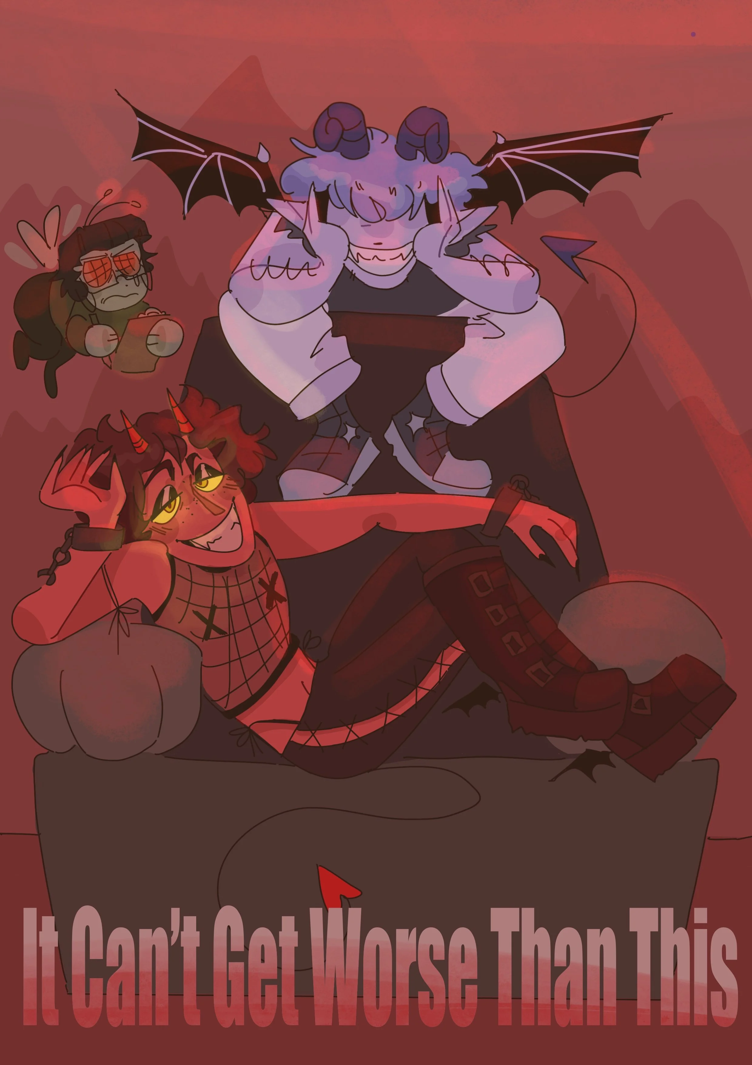 Red is a distractible high energy demon with more than a few screws loose. They have a big heart, despite being forced to promote sinning and general evilness. He loves to talk to people (and hear his voice in general) and is a bit of a party animal. His favorite hobby is pestering Mike till he implodes.